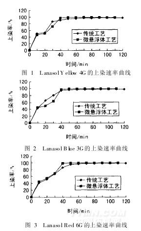 根據(jù)各自的最佳工藝條件,上述三種染料分別按傳統(tǒng)染色工藝和微懸浮體染色工藝對(duì)羊毛纖維進(jìn)行染色,兩種工藝下的上染速率曲線如圖1~3所示。