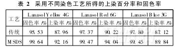 分別采用傳統(tǒng)染色工藝和微懸浮體染色工藝在各自最佳工藝條件下對(duì)羊毛纖維進(jìn)行染色,測(cè)定其上染百分率和固色率,結(jié)果如表2所示。