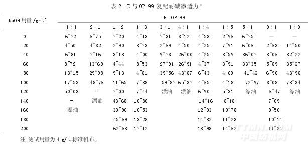 從表2測試數(shù)據(jù)可看出,隨著OP99在復配體系里的比例增大,耐堿滲透力表現(xiàn)的數(shù)值很好,但是它的泡沫也隨之增大。結合泡沫實驗數(shù)據(jù),確定了3∶1體系的耐堿滲透力和低泡沫為最佳值。以此比例與其他表面活性劑混配精練劑。