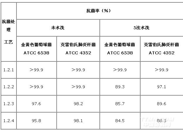 采用4組規(guī)格為40S/2經(jīng)過(guò)染色的灰色棉紗線,分別按照1.2.1、1.2.2、1.2.3和1.2.3的后處理工藝進(jìn)行處理,經(jīng)織襪機(jī)織成針織物后,然后送至SGS上海分公司按照1.3.1和1.3.3的檢測(cè)方法分別測(cè)試4組織物的抗菌率、5次水洗后的抗菌率,具體測(cè)試結(jié)果見(jiàn)下表。