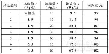 (2)方法的檢出限0.59ug/L,回收率94%~105%,標準曲線在0~72ug/L濃度范圍內特征濃度為0.94~1.12ug/L。