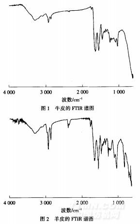 圖1和2分別是牛皮和羊皮的MR光譜圖.從圖1、圖2中可以看到,皮革光譜有一些很重要的吸收帶,如3300 ,2910 ,2860 ,1742 ,1650, 1550, 1445、1340,1244、1088和1028cm,在1268和804cm-'時(shí),牛皮與羊皮光譜中吸收帶不同是因?yàn)閮煞N皮革的化學(xué)構(gòu)造不同.而在約2400cm-1時(shí)的吸收帶是由環(huán)境中的一氧化碳引起的.表I解釋了分子振動(dòng)的屬性.