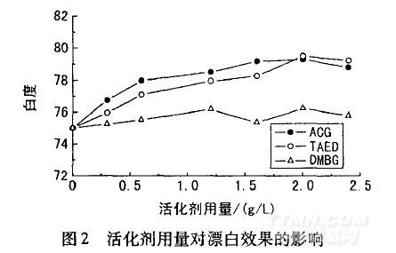 采用30%雙氧水3 L,純堿2g/L,硅酸鈉2g/L,漂白溫度60℃,漂白時間60min,試驗(yàn)不同用量ACG、DMBG和TAED對漂白織物白度的影響,結(jié)果見圖2。