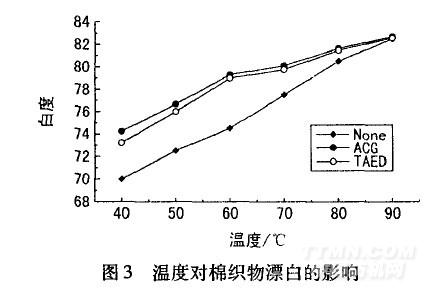 采用ACG和TAED作為棉織物雙氧水漂白活化劑,測試了不同溫度下織物的白度,結(jié)果如圖3所示。