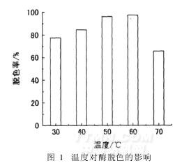 酶在使用過(guò)程中受到溫度限制,考查pH值6. 8、皂洗酶用量0. 25 g/L、調(diào)節(jié)劑AD用量1 g/L、處理時(shí)間15 min時(shí),不同溫度下皂洗酶A對(duì)染料脫色率的影響,結(jié)果如圖1所示。