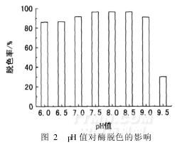 由圖2看出,皂洗酶pH值的應(yīng)用范圍較寬, pH值為7~9時(shí),脫色率最好,接近100%; pH值為6~7時(shí),脫色率能達(dá)到80%以上; pH值超過(guò)9,脫色率下降很快,說(shuō)明大部分酶已失活。因此, pH值宜選用7~9。