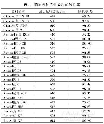 由表1知,酶對試驗用各種染料均有脫色效果,絕大多數(shù)染料的脫色率在90%以上;個別黃色品種的脫色效果較差,其原因還需從染料本身結(jié)構(gòu)作進一步分析。