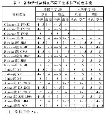 比較常規(guī)皂洗工藝和優(yōu)化的酶洗工藝(pH值7. 5)對各種活性染色織物色牢度的影響,見表2。
