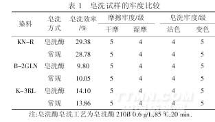 由表1可知,用皂洗酶皂洗的織物各項色牢度均與常規(guī)皂洗工藝一致.