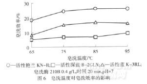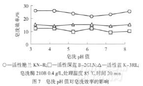 由圖6可知,當(dāng)皂洗溫度為65℃時,皂洗酶210B對染色織物具有一定的皂洗效果,隨著處理溫度的升高,皂洗效率逐漸增強(qiáng);85℃時,活性艷藍(lán)KN-R、活性藍(lán)K-3RL染色織物基本達(dá)到皂洗平衡.活性深藍(lán)B-2GLN>85℃皂洗時,皂洗效率略有提高,從能耗等方面綜合考慮,皂洗溫度選擇85℃.