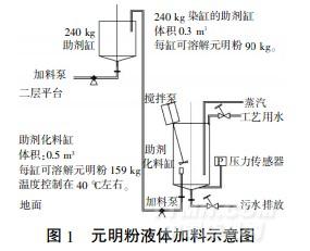 在筒子紗染色中袁染缸的高度通常離地面3m以上袁若使用固態(tài)元明粉加料方式袁則整個(gè)運(yùn)送過程會耗時(shí)費(fèi)力袁易形成飛塵袁污染車間環(huán)境袁損害操作工的身體健康遙且由于是固態(tài)粉末狀袁所以添加準(zhǔn)確度不易控制袁而加入的誤差會直接影響染色的質(zhì)量遙因此袁在筒子紗染色過程中袁嘗試采用液態(tài)元明粉的添加方式可以完善筒子紗染色過程袁獲得更好的染色質(zhì)量遙元明粉液態(tài)加料過程見圖1遙。