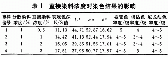 用分散紅S一5BL,直接紅Intralite 12B,在分散染料濃度為1%(owf),直接染料濃度分別為0.5%、1%、2%、3%(owf)時,對織物進(jìn)行染色,并測試染色織物的表觀色深K/S值,色度指標(biāo)L*、a*、b*及耐水洗色牢度,結(jié)果見表1。