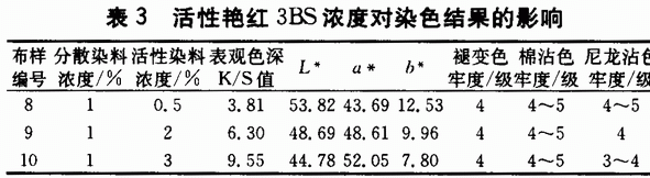 用分散紅S一5BL,活性艷紅3BS,采用分散/活性一浴二步法染色,在分散染料濃度為1%(owl),活性染料濃度分別為0.5%、2%和3%(owf)時對織物進(jìn)行染色,并測試染色織物的表觀色深K/S值,色度指標(biāo)L*、a*、b*及耐水洗色牢度,結(jié)果見表3。
