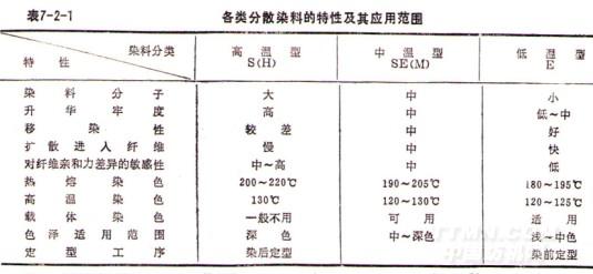 分散染料商品在國內(nèi)通常是按滌綸的染色溫度分類,有高溫型、中溫型和低溫型三類。它們的特性見表7-2-1.