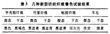 著色試驗(yàn)結(jié)果表明,甲殼胺纖維著色后的濕態(tài)為黑色,干態(tài)為黑褐色,濕、干態(tài)差異較??;竹漿纖維著色后濕、干態(tài)不變色,均為黑藍(lán)青;粘膠纖維濕態(tài)為黑藍(lán)青,干態(tài)為深灰色;羊毛濕、干態(tài)均為黃色。
