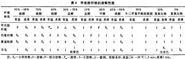溶解,粘膠和羊毛不溶;在常溫和煮沸的88%甲酸溶液中,甲殼胺纖維部分溶解和立即溶解,而粘膠、竹漿纖維及羊毛都不溶;在常溫下的36%一38%鹽酸溶液和煮沸后的30%氫氧化鈉溶液中,甲殼胺纖維出現(xiàn)膨潤(rùn)現(xiàn)象,與纖維素纖維和羊毛纖維溶解性差別明顯,容易區(qū)分。通過化學(xué)試劑溶解試驗(yàn)比較分析得知,選用88%甲酸溶液可以準(zhǔn)確鑒別出甲殼胺纖維。