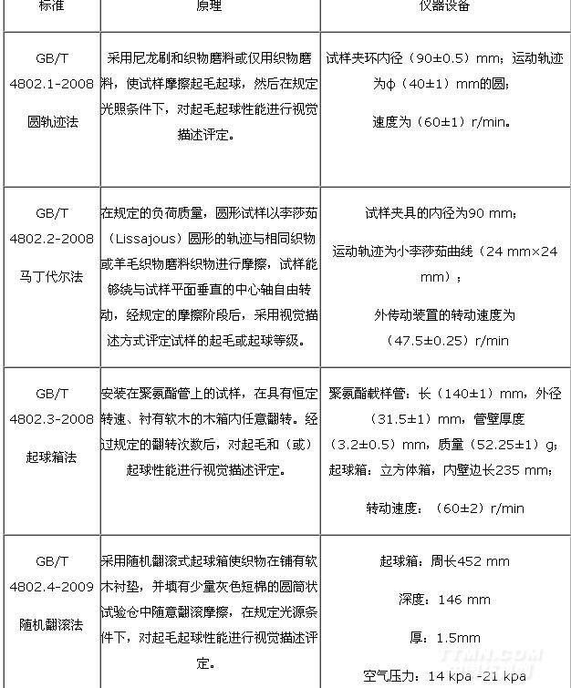 2008年全國紡織品標準化技術(shù)委員會發(fā)布了GB/T 4802.1-2008《織物起毛起球性能的測定 第1部分 圓軌跡法》、GB/T 4802.2-2008《織物起毛起球性能的測定 第2部分 改型馬丁代爾法》、GB/T 4802.3-2008《織物起毛起球性能的測定 第3部分 起球箱法》三個檢測織物抗起毛起球性能的標準,分別替代各自1997年版的標準,新標準從2009年3月1日開始實施。GB/T 4802.4-2009《織物起毛起球性能的測定 第4部分 隨機翻滾法》于2009年6月19日獲批準,將于2010年2月1開始實施。本文根據(jù)這四種織物起毛起球性能的不同檢測方法進行試驗,并對結(jié)果進行比較,同時對有多種測試條件的測試方法進行測試條件的比較,分析各測試條件對測試結(jié)果的影響,從而分析標準中指標的合理性、試驗方法的科學(xué)性及新舊標準的更替對產(chǎn)品標準產(chǎn)生的影響。