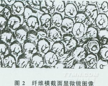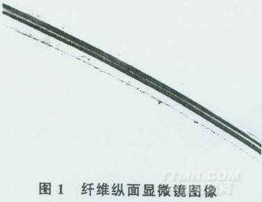 從圖1可以看出,纖維縱面呈透明的圓柱形態(tài),有中腔(黑影部分)影像。從圖2可以看出,纖維橫截面有中腔,呈規(guī)則的圓形(也有多邊形的)。