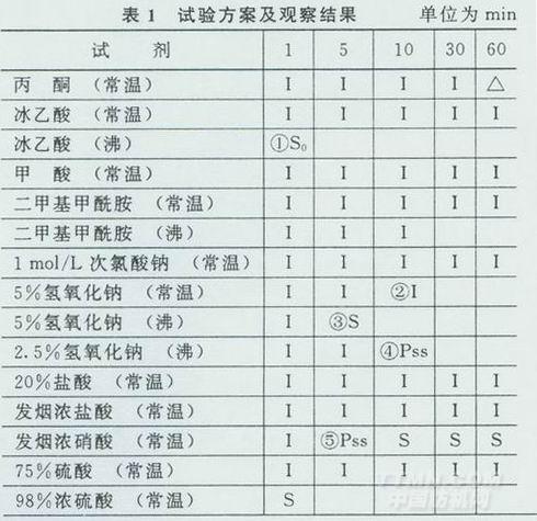 從實驗室樣品中任意抽取試驗樣品,按1 g試樣100 mL。溶劑的比例分別放進盛有表1所列的溶劑的燒杯中。視溶解的情況,分別攪拌或煮沸1、5、10 min……后靜置幾秒鐘,觀察結(jié)果詳見表1。