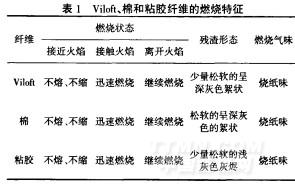 燃燒法利用各種纖維的化學(xué)組成不同其燃燒特征差異來鑒別纖維的種類.具體方法是取—小束(質(zhì)量50~100mg)纖維試樣著火燃燒,仔細觀察纖維燃燒特征和殘渣的形態(tài)、顏色、軟硬程度,同時嗅其產(chǎn)生煙霧的氣味等.Vilofl纖維和棉、粘膠纖維的燃燒特征如表1所示.