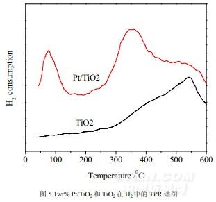 從圖中可以看出,純TiO2載體在540℃附近的一個(gè)很寬的還原峰,該峰對(duì)應(yīng)為TiO2的還原峰,與文獻(xiàn)報(bào)道值為600℃左右稍有出入。若要還原聚合體TiO2中的氧,其還原溫度必須高于600℃。而1wt%Pt/TiO2催化劑上,除了純載體在540℃左右的耗氫峰外,在77℃和353℃附近出現(xiàn)了兩個(gè)耗氫峰。在77℃處耗氫峰對(duì)應(yīng)于氧化鉑PtOx還原為金屬Pt所消耗的氫氣,而353℃左右的峰屬于載體表面氧還原時(shí)的氫氣消耗峰,這也說明Pt的負(fù)載豐富了催化劑表面氧物種,并且減弱了Ti-O鍵,促進(jìn)了TiO2表面氧的活性,此即催化劑Pt/TiO2具良好催化活性的另一重要原因。