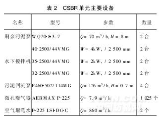(2)CSBR池。尺寸74.18m×57.54m×7m,有效水深6.25m,HRT28h。厭氧池及缺氧池中設(shè)置水下攪拌器,好氧池安裝微孔曝氣器系統(tǒng),采用漸減曝氣方式布置。由空氣主管供氣。根據(jù)池內(nèi)溶解氧值的設(shè)定,調(diào)節(jié)每條空氣主管上的空氣調(diào)節(jié)閥。CSBR單元主要設(shè)備詳見表2。