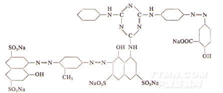 這些燃料在分子結(jié)構(gòu)中含有三聚氰胺的結(jié)構(gòu),對(duì)纖維素纖維具有很好的親和力,日曬牢度也好,但是品種不多,一般只有綠、紅和藍(lán)色三種主要色澤。它們是由三聚氰胺與具有單機(jī)的染料或芳香胺類縮合成為三聚氰胺結(jié)構(gòu)的化合物。因?yàn)楫?dāng)水中有堿性物質(zhì)(如純堿)存在時(shí),三聚氰綠中的三個(gè)氯基可以逐步地被不同的有機(jī)胺類(包括具有氨基染料)所置換。有些綠色的直接染料也由一分子藍(lán)色染料與三聚氰胺中一個(gè)氮基縮合,另一個(gè)氮基與一分子的黃色染料縮合,三聚氰胺上最后一個(gè)氯基與苯胺縮合而成。在這一染料縮合之前,所有的藍(lán)色染料和黃色染料對(duì)纖維素纖維都是沒有親和力的,經(jīng)縮合后,不但成為具有良好親和力的而直接染料,而且染料的顏色也等于兩種燃料的拼色效應(yīng)(黃+藍(lán)=綠)。這一現(xiàn)象是很珍貴的,因?yàn)榫G色染料往往是有黃色和藍(lán)色拼混而成,由于上染速率的而不同,是染色織物的色澤前后不一致,而綠色直接染料的應(yīng)用要簡(jiǎn)便得多。