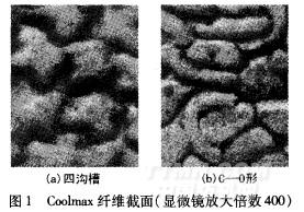 200F;反面暴露“+”形纖維,規(guī)格為16.6tex/144F,兩種纖維的截面形狀見圖1[1]