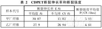 (2)測(cè)定CDPET纖維強(qiáng)力和斷裂伸長(zhǎng),如果纖維強(qiáng)力和斷裂伸長(zhǎng)存在明顯差異,也有可能不是同一種(批)CDPET纖維。表2是在紡紗現(xiàn)場(chǎng)對(duì)兩家不同供貨廠家的CDPET纖維抽樣作拉伸和強(qiáng)力試驗(yàn)的數(shù)據(jù)。