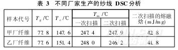 例如,對(duì)某企業(yè)同期使用的兩家廠生產(chǎn)的CDPET纖維作熱分析,得出表3測(cè)試結(jié)果。