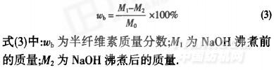 式(3)中:姚為半纖維素質(zhì)量分?jǐn)?shù);M。為NaOH沸煮前的質(zhì)量;M2為NaOH沸煮后的質(zhì)量.