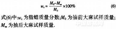 麻纖維中的脂是高級脂肪酸的甘油酯,蠟質(zhì)的主要成分是高級飽和脂肪酸和高級一元醇所形成的酯,此外,尚有部分游離的高級脂肪酸、高級醇及烴類.脂和蠟均不溶于水,但可被有機溶劑萃?。捎觅|(zhì)量法測定,稱取3 g麻試樣,烘干稱質(zhì)量后放在油脂抽出器中,用苯和乙醇溶液[V(苯):V(乙醇)=2:l]在恒溫下萃取4 h(回流速率4-6次/}1),烘干稱質(zhì)量,按公式(6)計算脂蠟的質(zhì)量分數(shù):
