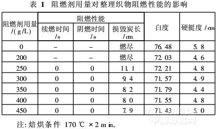 阻燃劑用量是影響阻燃效果的一個關(guān)鍵因素,同時也影響著織物手感、白度等其它性能。試驗考察了阻燃劑用量對整理織物阻燃性能的影響,見表1。