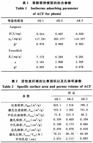 圖1(b)給出的是3種活性炭纖維的苯酚吸附用Freundlich模型擬合的吸附等溫線。具體的擬合參數(shù)見表1。表1對于2種模型做了比較。由2種吸附等溫線的可以看出,F(xiàn)reundlich模型比Lang—muir模型擬合的更好。這是因?yàn)長angmuir模型是基于吸附劑是同質(zhì)的吸附表面的假設(shè);Freundlich模型是基于吸附劑的表面具有不同吸附位及吸附能的假設(shè),而活性炭纖維的表面更符合Freundlich模型的假設(shè)。