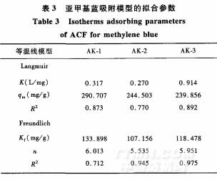 圖2(a)給出的是3種木棉基活性炭纖維的用Langmuir方程擬合的亞甲基藍(lán)吸附等溫線。擬合的參數(shù)由表3給出。由圖2(a)可以看出,3種活性炭纖維吸附亞甲基藍(lán)的容量大小順序是AK一1>AK一3>AK-2。其中,AK-1遠(yuǎn)遠(yuǎn)大于AK一3和AK-2,而后兩者吸附量近似一樣。這種趨勢從Langmuir擬合的參數(shù)q亦可以看出。同時(shí),用Langmuir方程擬合的效果并不好,都在0.7~0.8之間。