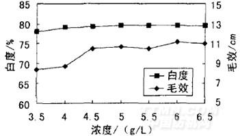 min,碳酸鈉質(zhì)量濃度2L,測(cè)定精練劑質(zhì)量濃度對(duì)精練效果和彈性性能的影響的影響,結(jié)果見圖1和圖2。