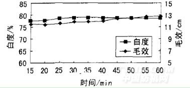 由圖5可知,精練時間從25min至30min,毛效提高較明顯;之后隨著時間增加,毛效增加緩慢;超過45min后,毛效基本恒定。