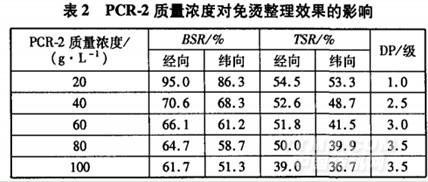 按“1.2節(jié)免燙整理工藝”,改變免燙整理劑PCR-2質(zhì)量濃度,試驗(yàn)免燙整理劑質(zhì)量濃度對織物免燙效果及織物強(qiáng)力的影響,結(jié)果見表2。