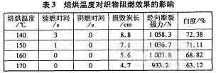 由表3可以看出,焙烘溫度升高,損毀炭長減小,阻燃效果增強,這是因為阻燃單體NPAZ與陰離子水性聚氨酯大分子之間的架橋反應(yīng)需要一定的溫度和時間。隨著焙烘溫度的升高,架橋反應(yīng)更充分,更多的阻燃單體NPAZ與陰離子水性聚氨酯反應(yīng),結(jié)合在棉織物的表面和縫隙之間。隨著溫度的升高,發(fā)生黃變的程度增大。因此。低溫焙烘白度較好,高溫白度較差,特別是170℃時,白度下降較明顯。綜合考慮,焙烘溫度選160℃為宜。