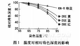 中溫型活性染料(KN型、M型、B型、A型)在酸性條件下染錦綸,除少數(shù)染料可能與纖維發(fā)生共價鍵結(jié)合外,基本上是以酸性染料的方式上染錦綸。因此,大多數(shù)染料對染色溫度的依附性較大。