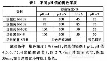 大多數(shù)活性染料只有在酸性浴中染錦綸,才能獲得高上染率。染浴pH值在4~5時,除個別染料外,大多數(shù)中溫型活性染料得色最深;pH值<4時,最終得色深度不會明顯提高,染色牢度卻有所下降,且手感變粗糙;pH值>5時,得色量會顯著變淺,變淺程度隨染料品種而異(見表1)。