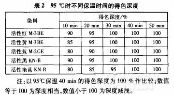 活性染料在酸性條件下染錦綸,染料吸附快,上染能力強,在較低溫度下,有較好的上染行為。因此,從室溫到沸染的升溫過程,尤其在7O℃以后,染料上色很快;當達到95℃時,錦綸纖維的表觀深度,一般可達到平衡染色深度的7O%以上。所以95℃以后,保溫時間對最終得色深度的影響相對較小(表2)。