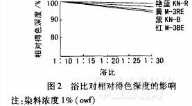 KN型、M型等中溫型活性染料在酸性沸染條件下,對錦綸的上染率都比較高,染中淺色時,腳水的吸盡程度好,浴比的大小對得色深度的影響相對較小。