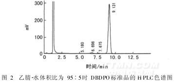 由圖1可見,當流動相為甲醇-緩沖鹽體系時,DPDBO的保留時間很長,兩色譜峰離的很近,且采用緩沖鹽體系操作繁瑣,對儀器損耗很大。