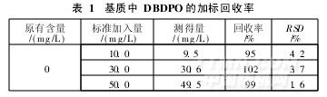 方法回收率試驗按照通常的添加試驗進行。選用不含DBDPO的樣品為基質,設定了3個添加濃度,按試驗條件和方法,對每個濃度進行8次添加回收試驗,得到回收率結果見表1。