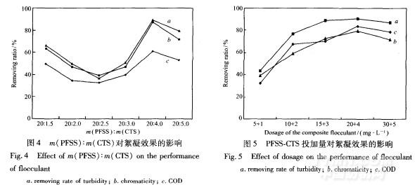 2.3.2投加量對絮凝效果的影響在PFSS與CTS質量比為5:1時,復合絮凝劑的投加量對絮凝效果的影響如圖5所示。PFSS-CTS的用量為(20+4)mg/L時,城市廢水的色度、濁度和COD的去除率達到最高,分別為79.69%、90.97%和83.45%,繼續(xù)增加復合絮凝劑的用量,色度、濁度和COD的去除率均呈下降趨勢。因為當投加量不足時,絮凝劑無法完全絮凝水中膠粒,但是當加入絮凝劑的量過多(超過等電點)時,由于靜電排斥作用,絮凝劑膠體懸浮于溶液中,所以濁度、色度和COD的去除率出現(xiàn)下降趨勢。此外過多的絮凝劑,包圍和覆蓋水中的膠體粒子,使懸浮粒子處于穩(wěn)定狀態(tài),不能聚沉。