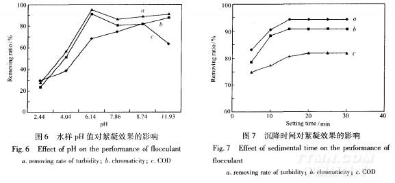 2.3.4沉降時間采用(20+4)mg/L復合絮凝劑PFSS.CTS,處理pH=7的城市廢水,沉降時間對城市廢水的除濁、除色和COD的去除的影響如圖7所示。從圖7可以看出,隨著沉降時間的延長,濁度、色度和COD的去除率均明顯增大,但在靜止沉降15min后,基本趨于平緩,在15min時,處理效果最好,其濁度、色度和COD的最大去除率分別為94.31%、90.71%和81.87%。