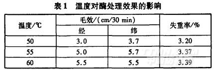 表1中,處理溫度為55℃和60℃時(shí),汗布的失重率和毛效接近,與文獻(xiàn)[1]中酶活最佳溫度范圍相符??紤]到生產(chǎn)中加料溫度一般控制在50-55℃,并且需要蒸汽加熱,為防止局部加熱導(dǎo)致酶失活,酶處理溫度選用55℃。