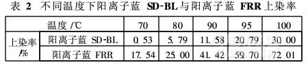 子性,與PARSTER纖維上的陰離子基團(tuán)反應(yīng)生成離子鍵,從而完成染色過(guò)程。下面以分散型陽(yáng)離子藍(lán)SD-BL與陽(yáng)離子藍(lán)FRR為例,比較它們?cè)谌旧跗诓煌瑴囟认碌纳先韭省?/p>