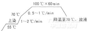 眾所周知,當(dāng)染色溫度超過(guò)了纖維的玻璃化溫度時(shí),纖維的大分子鏈運(yùn)動(dòng)增加,纖維結(jié)構(gòu)變得相對(duì)疏松,大量染料在較短的時(shí)間內(nèi)迅速上染,從而造成染色不勻。因此,染色過(guò)程中必須嚴(yán)格控制升溫速率。當(dāng)溫度在70℃以下時(shí),升溫速率為1. 5~2℃/min;當(dāng)溫度到達(dá)PARSTER纖維的玻璃化溫度后,升溫速率應(yīng)控制在0. 5~1℃/min,具體升溫曲線如下: